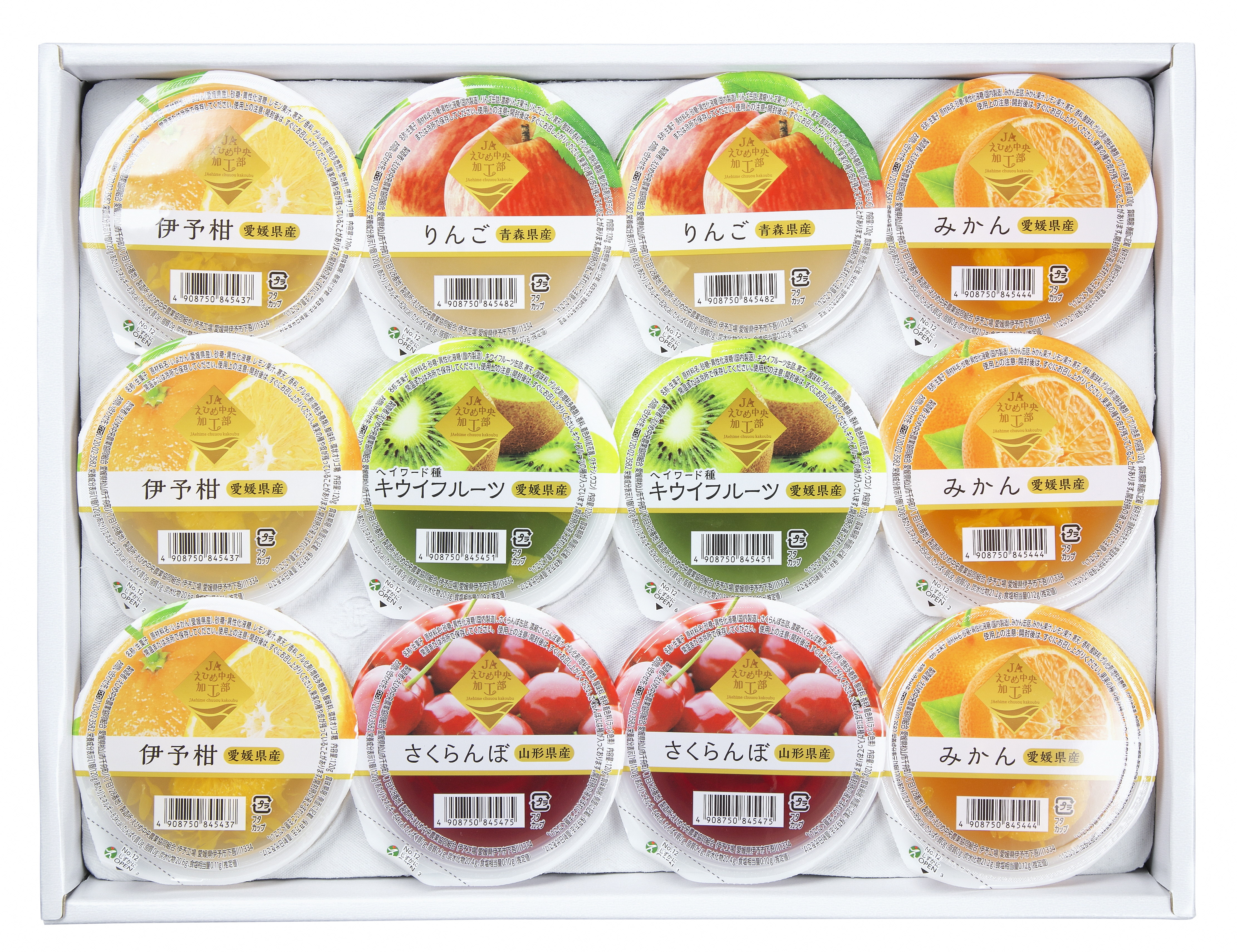国産&愛媛県産フルーツを使用したまるごと果樹園フルーツゼリーセット。みかん、伊予柑、さくらんぼ、キウイフルーツ、りんごの果物を使用したゼリーです。