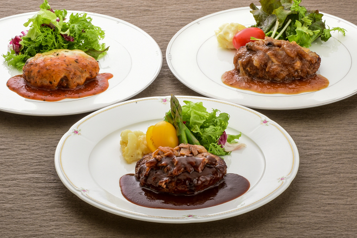 デミグラスハンバーグ:焼き上げたハンバーグにマッシュルーム・玉ねぎをのせ、たっぷりのソースをかけて仕上げています。