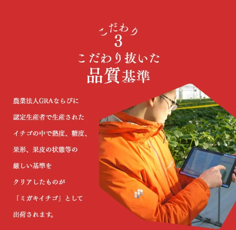 匠の経験とIT技術を掛け合わせた栽培方法で、厳しい基準をクリアしたものがミガキいちごとして出荷されます。