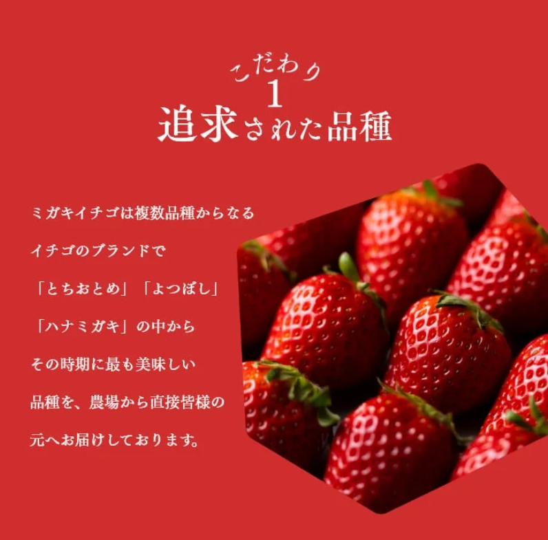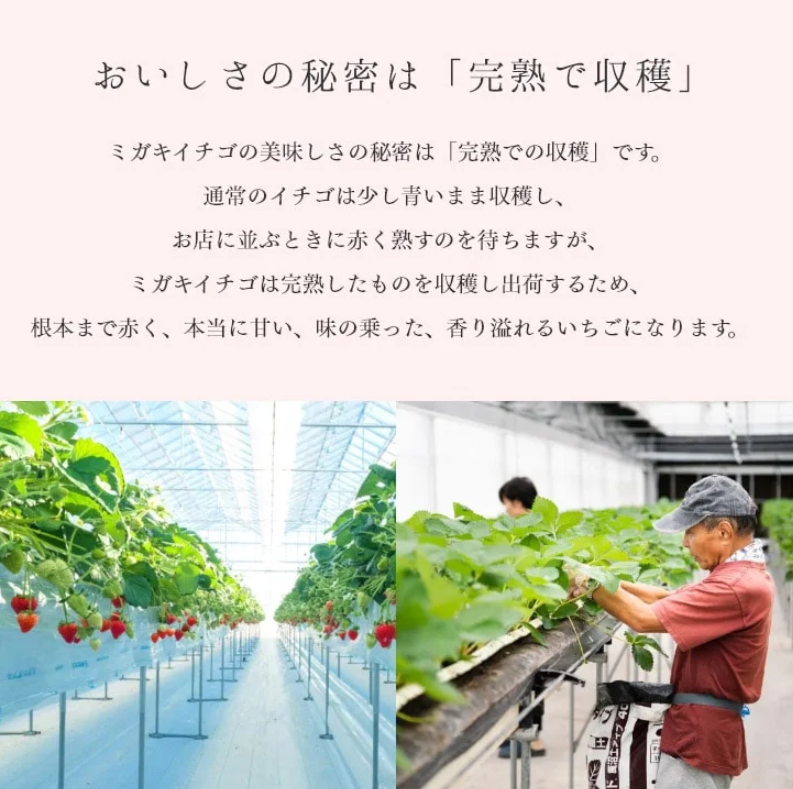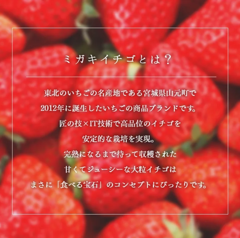 匠の経験とIT技術を掛け合わせた栽培方法で、厳しい基準をクリアしたものがミガキいちごとして出荷されます。